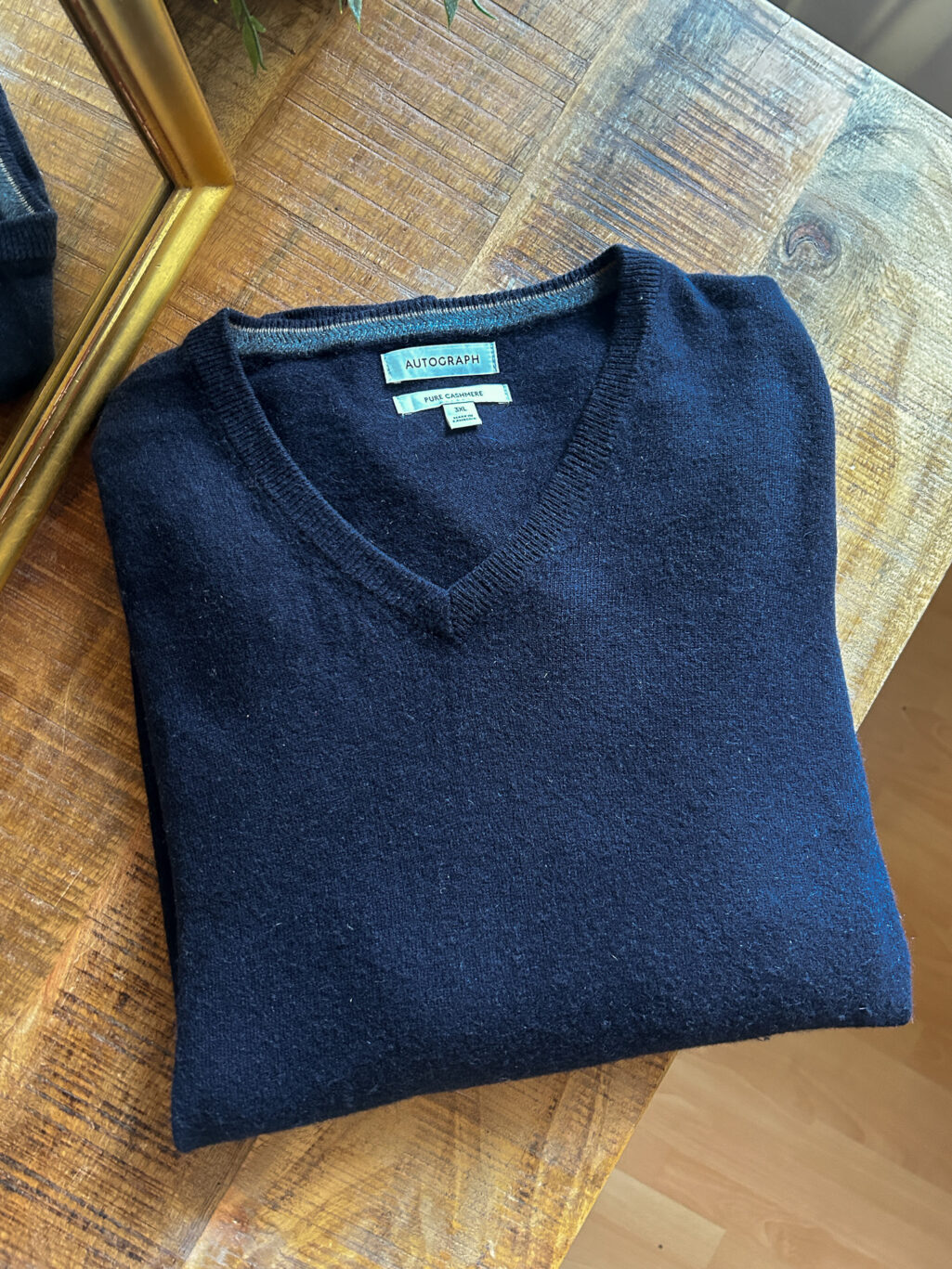 Dunkelblauer Cashmere-Pullover der Marke Autograph aus 100 % reinem Cashmere in Größe 3XL. Das zeitlose Design und der klassische Schnitt machen dieses Modell vielseitig kombinierbar. Der hochwertige Cashmere sorgt für ein besonders weiches Tragegefühl und hohen Komfort.