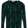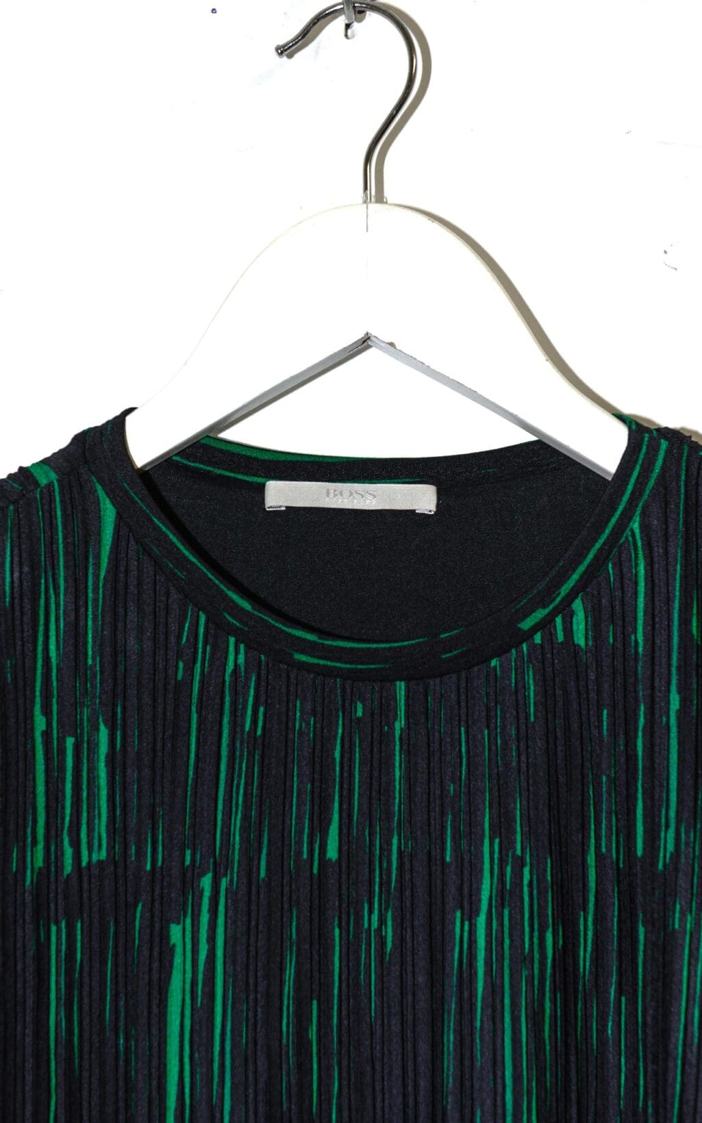 Boss Top mit langen Ärmeln in Schwarz mit feinem Plissee und grünem Muster. Lockerer Schnitt und Rundhalsausschnitt. Secondhand-Designer-Top.