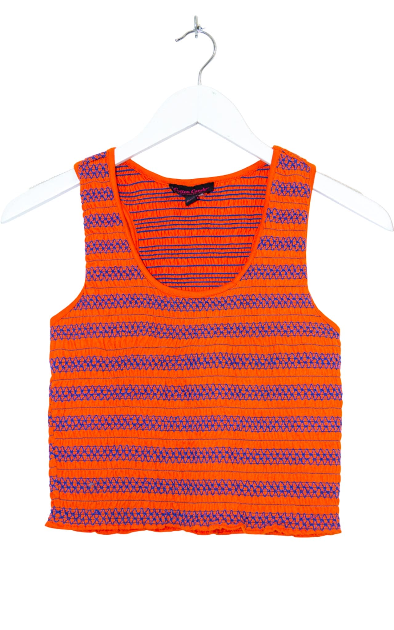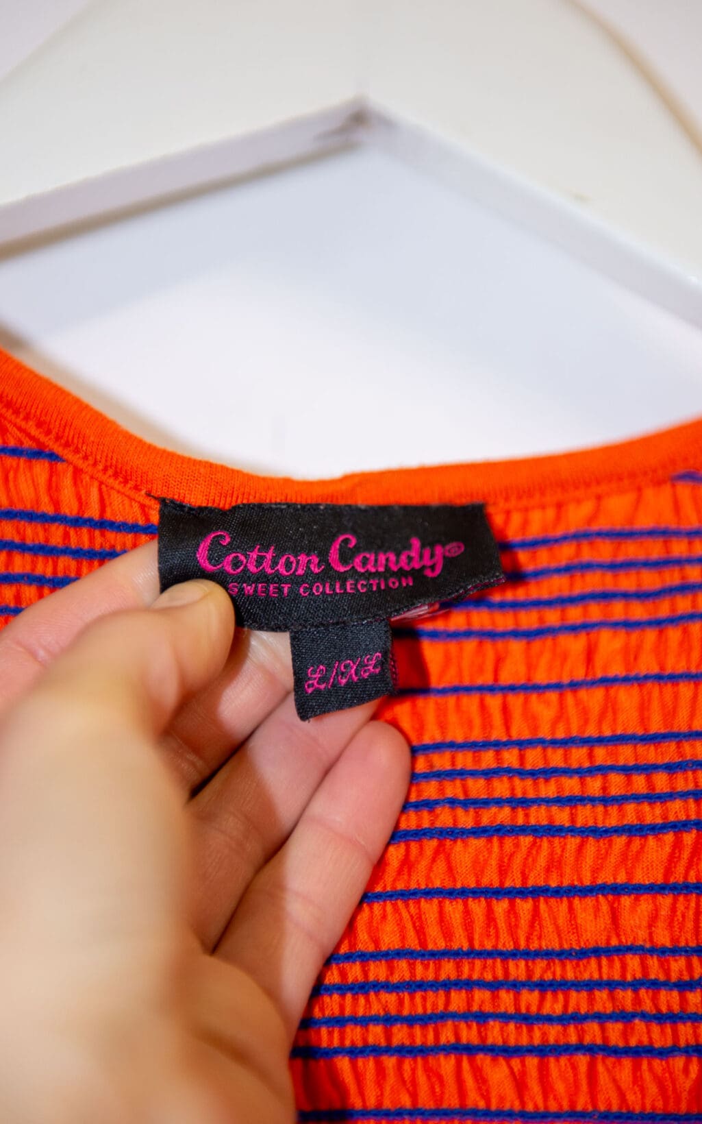 Das Cotton Candy Sporttop in Orange mit blauer Stickerei kombiniert einen trendigen, sportlichen Look mit verspielten Details. Das cropped Design sorgt für eine moderne Passform, während die feine Stickerei einen besonderen Akzent setzt. Ideal für lässige Outfits oder als stylisches Activewear-Teil.