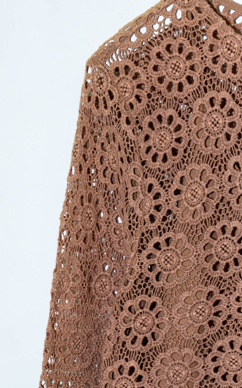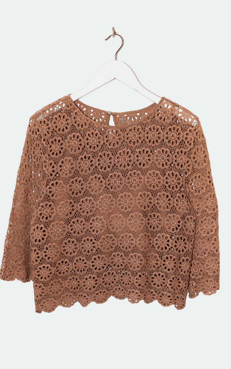 Der warme Camel-Ton und das florale Spitzenmuster machen es zu einem vielseitigen Teil – tragbar über Tops, Blusen oder direkt auf der Haut.