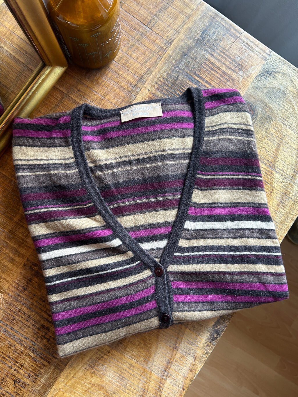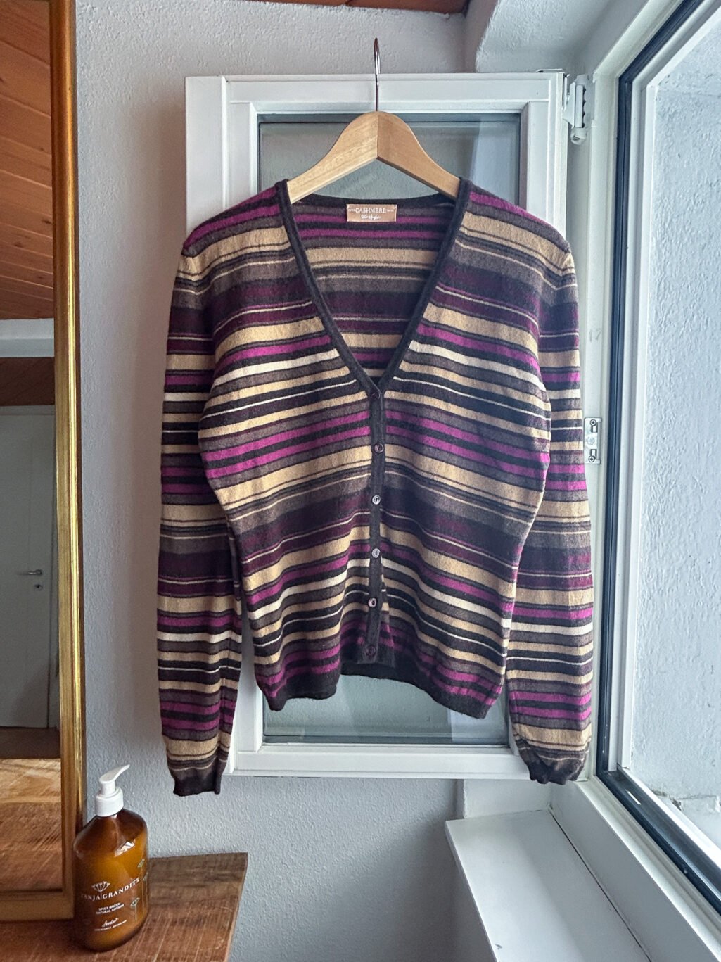 Cashmere-Cardigan von El Corte Inglés aus 100 % Cashmere mit zeitlosem Streifenmuster in Beige, Braun, Bordeaux und Violett. Locker geschnitten, leicht im Fall und angenehm auf der Haut. Ein unkompliziertes Cashmere-Stück, das Farbe ins Outfit bringt und sich vielseitig kombinieren lässt.