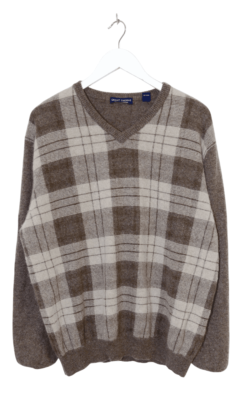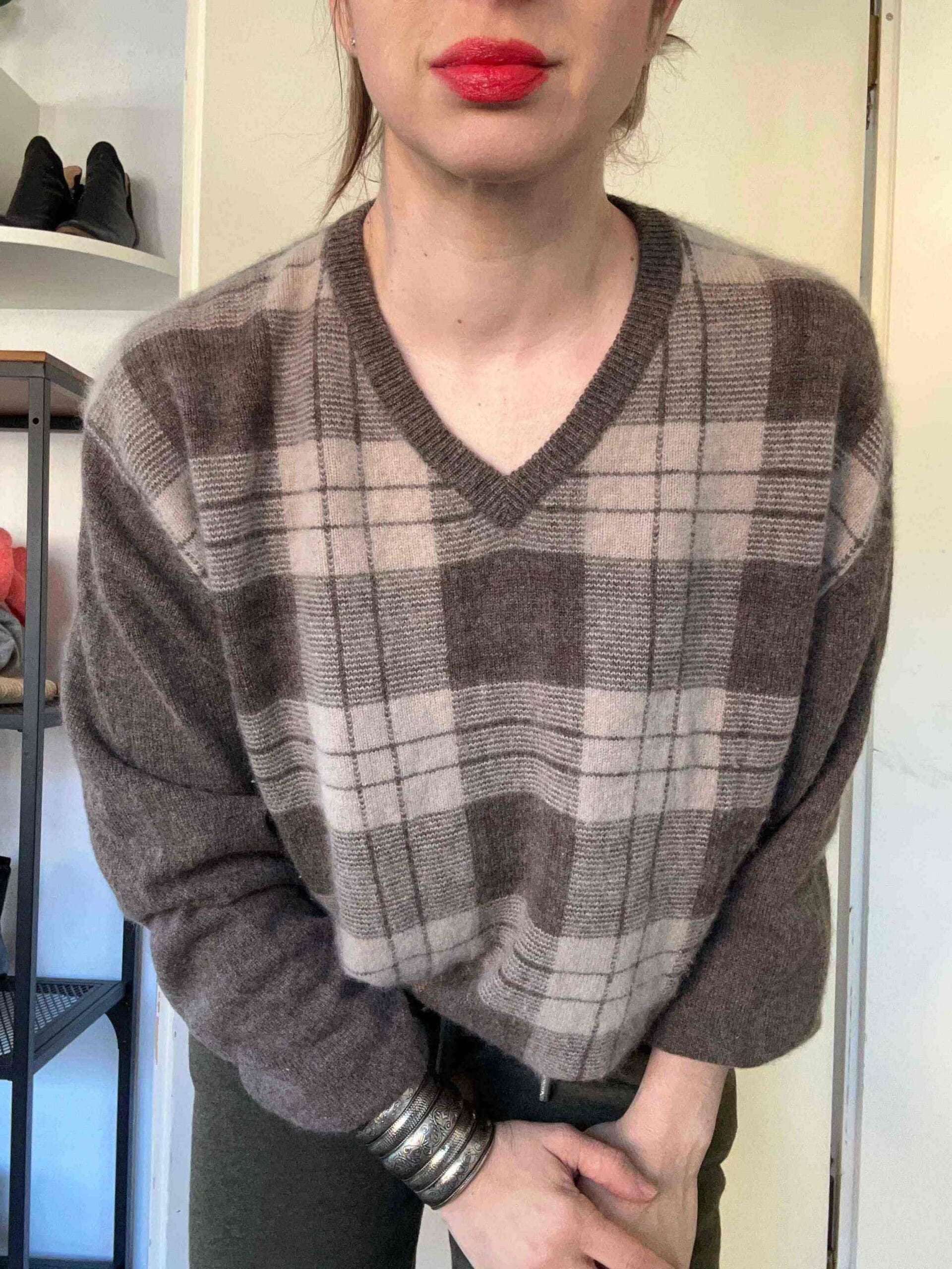 Weicher Kaschmir, lockerer Schnitt und ein zeitloses Karomuster in Beige und Braun – dieser Pullover ist purer Everyday-Luxus. Der klassische V-Ausschnitt sorgt für eine elegante Silhouette, während das hochwertige Material maximalen Tragekomfort verspricht. Ob für Meetings, Kaffee mit Freund*innen oder einfach zum Wohlfühlen: Dieser Secondhand-Kaschmirpullover passt immer. Unaufdringlich, stilvoll und bereit für dein nächstes Outfit.