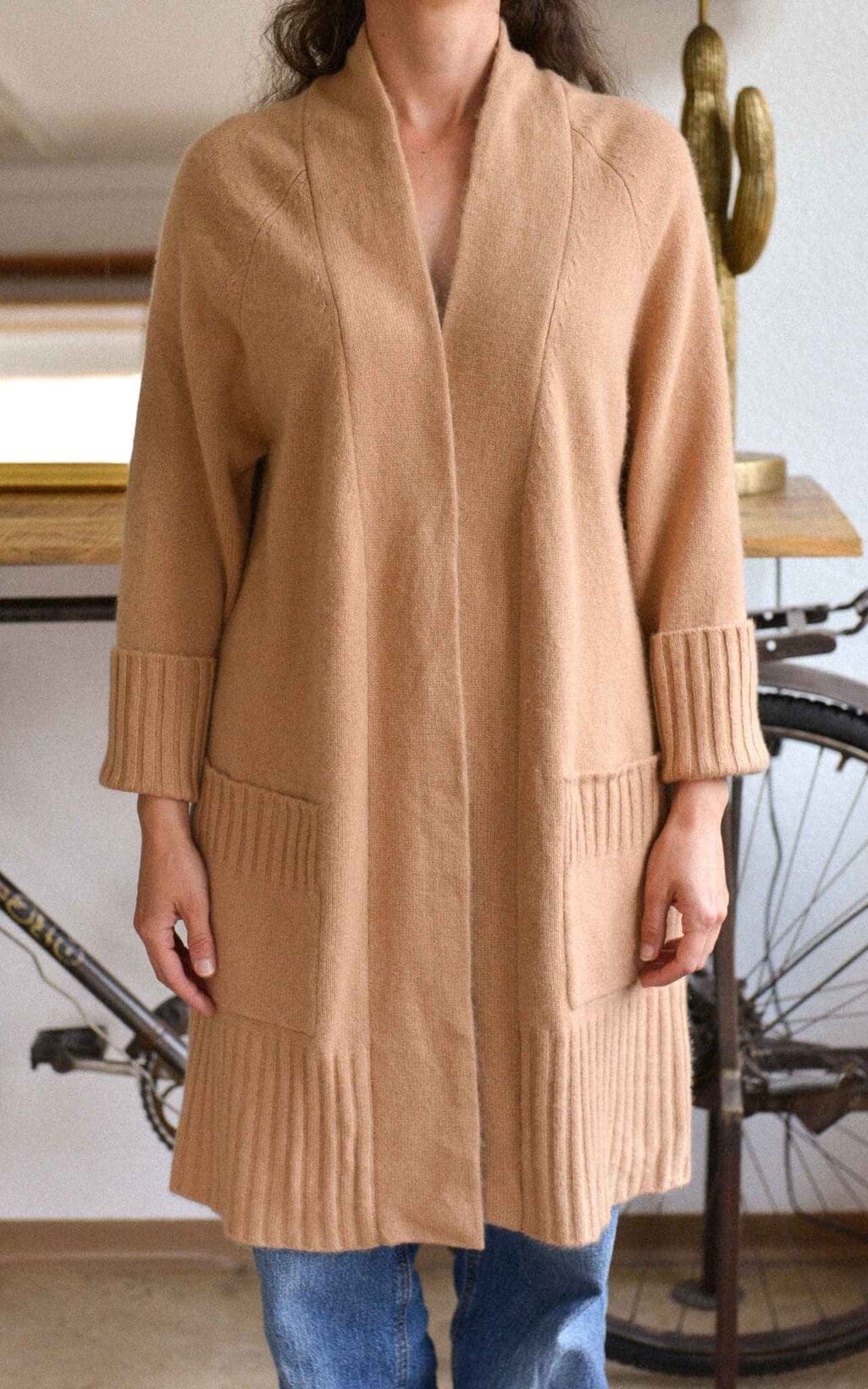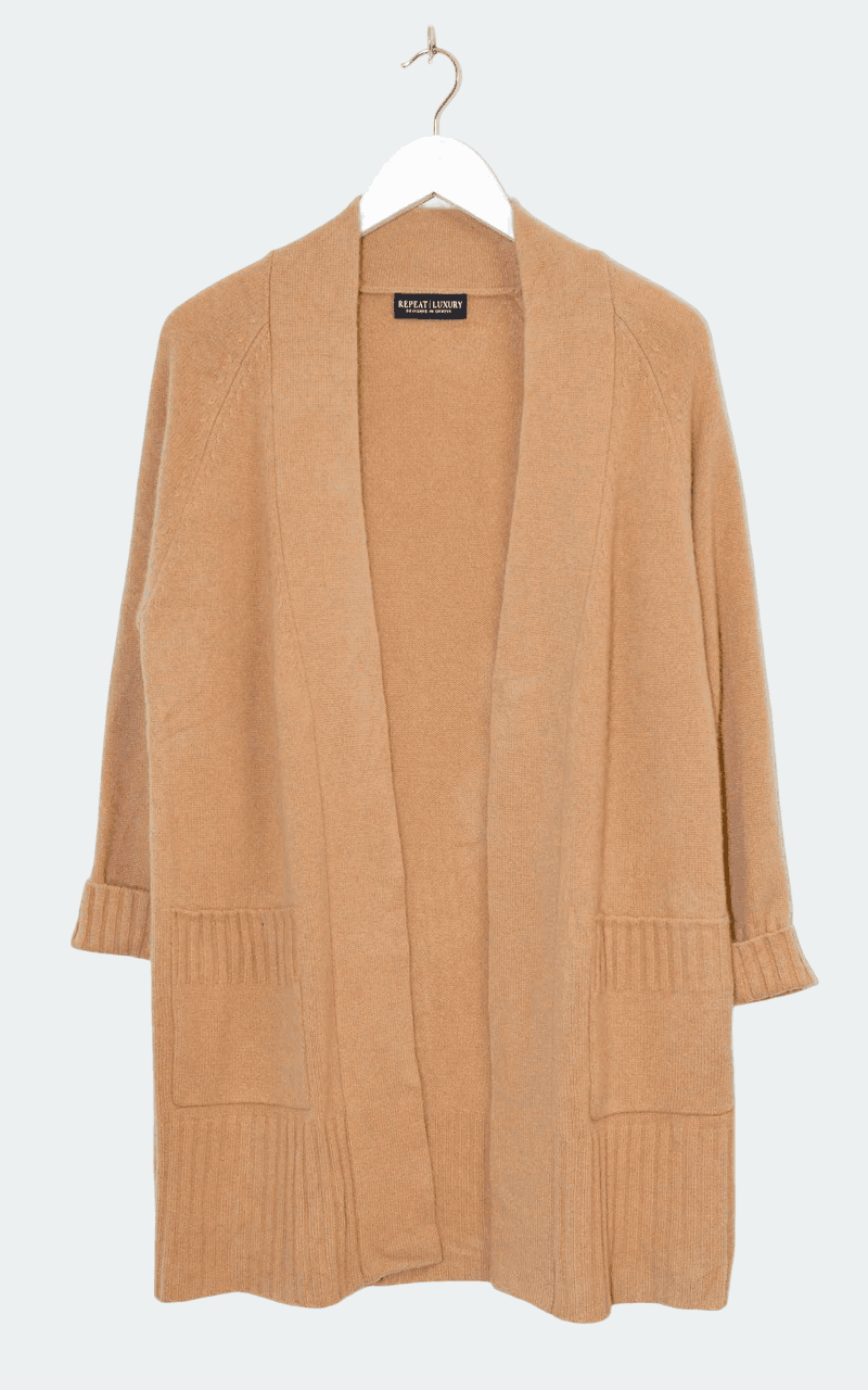 Repeat Luxury Cardigan in Beige, lang geschnitten aus 100 % Kaschmir – edel, weich und zeitlos.