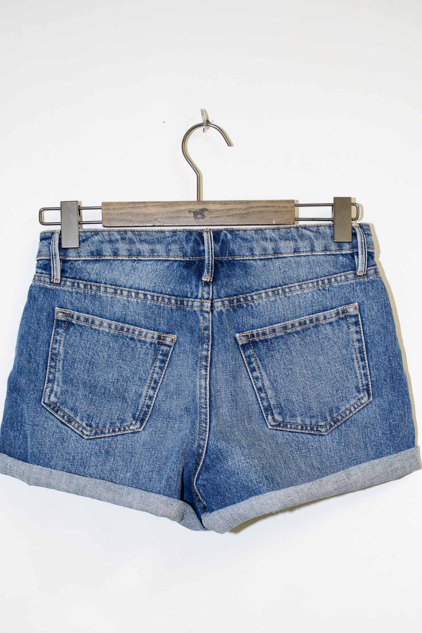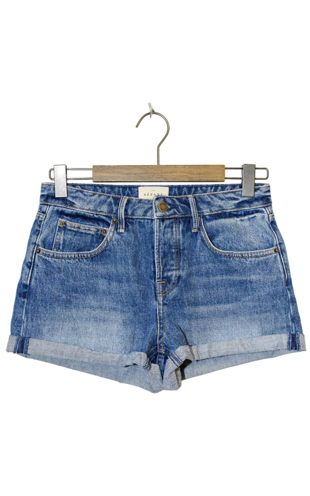 Sézane Denim Shorts mit gefaltetem Saum. Ein stilvolles und feminines Design für sommerliche Looks.