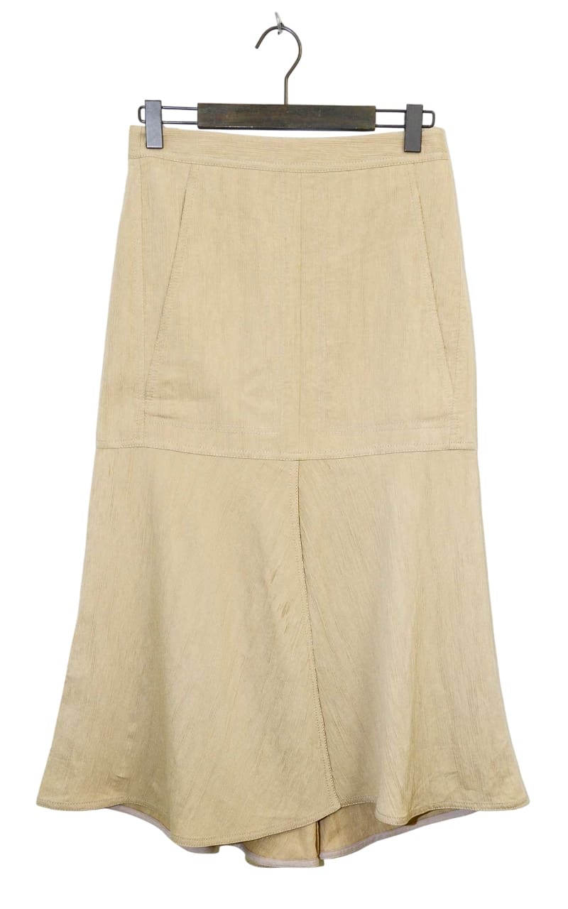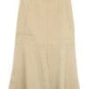 Tibi Rock in Beige, lang geschnitten mit Volant am Ende und praktischen Seitentaschen. Ein elegantes, aber verspieltes Design, das sich perfekt für verschiedene Anlässe eignet.